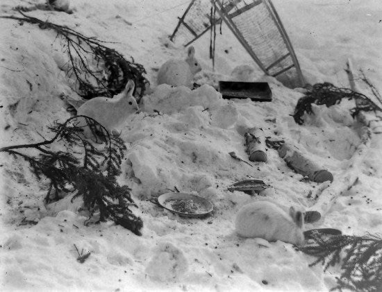 Photograph of three rabbits visiting a winter campsite. Snowshoes can be seen in background.