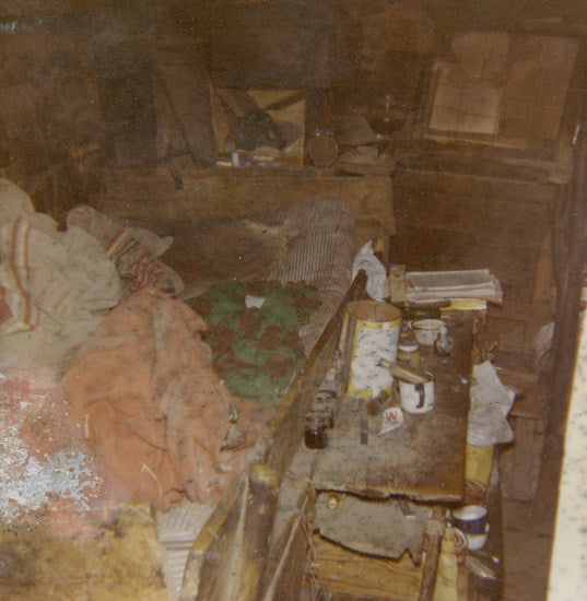 Colour photograph of the interior of a room which is cluttered with a variety of items. There is a mattress with blankets on it and a table beside the bed which is cluttered with tins and other smaller things.