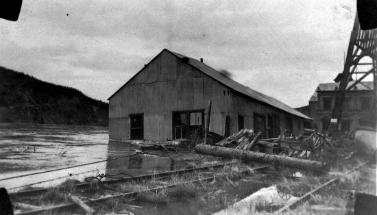 View taken looking north on Front Street during the flood of 1925. The Klondike Mines Railway warehouse is in the water. Bank of Commerce building can be seen in the background.