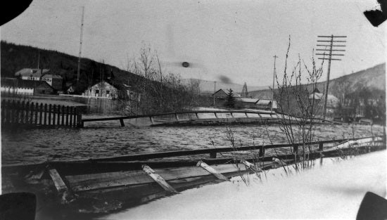 View of the bridge on Fifth Ave. Photo taken from Fifth and Turner looking north. Appears to be during the flood of 1925.